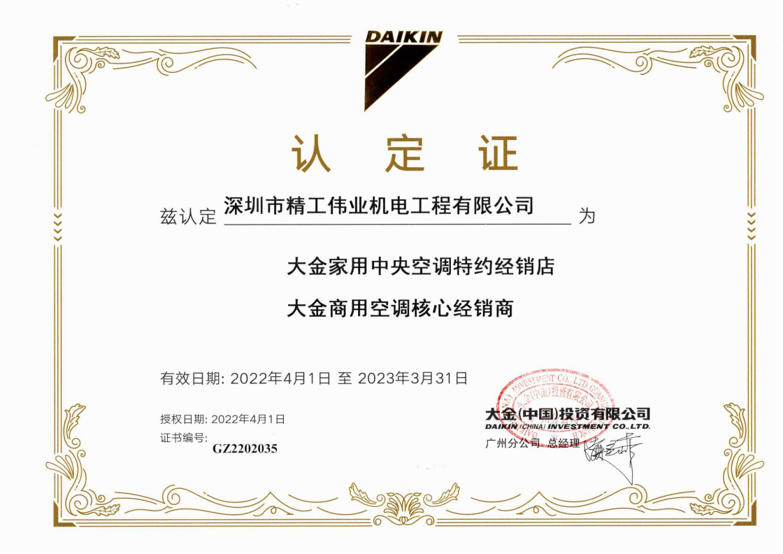 2022年4月1日,开云网页 被开云官方登录网站入口 公司官方认定为“大金商用空调核心经销商、大金家用中央空调特约经销店”