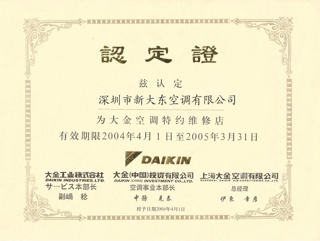 2004年4月1日,开云官方登录网站入口 公司认定深圳市新大东空调有限公司为开云官方登录网站入口 特约维修店认定证